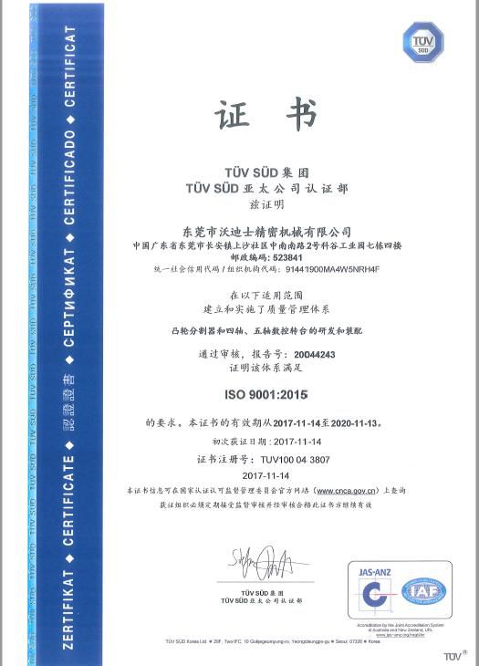 近日沃迪士在"凸輪分割器和四軸、五軸的研發(fā)和裝配”的質量管理上的有效性通過了國際權威認證機構南德TUV SUD第二階段的嚴格審廠,獲得了ISO9001:2015 證書。