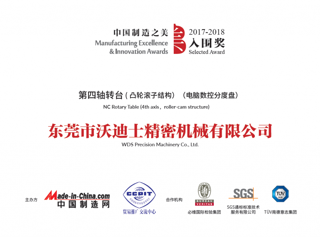 沃迪士參賽產品(第四軸轉臺 (凸輪滾子結構)(電腦數(shù)控分度盤))經過初評、終評兩輪評選,從中國制造之美2017屆13個參賽組別4309件參賽產品中脫穎而出,榮獲2017“中國制造之美”年度評選 工業(yè)設備及組件 類 入圍獎!并將獲得由活動主辦方中國制造網、貿促會貿推中心,聯(lián)合國際三大知名認證機構SGS、BV、 TüV南德頒發(fā)的榮譽獎牌。