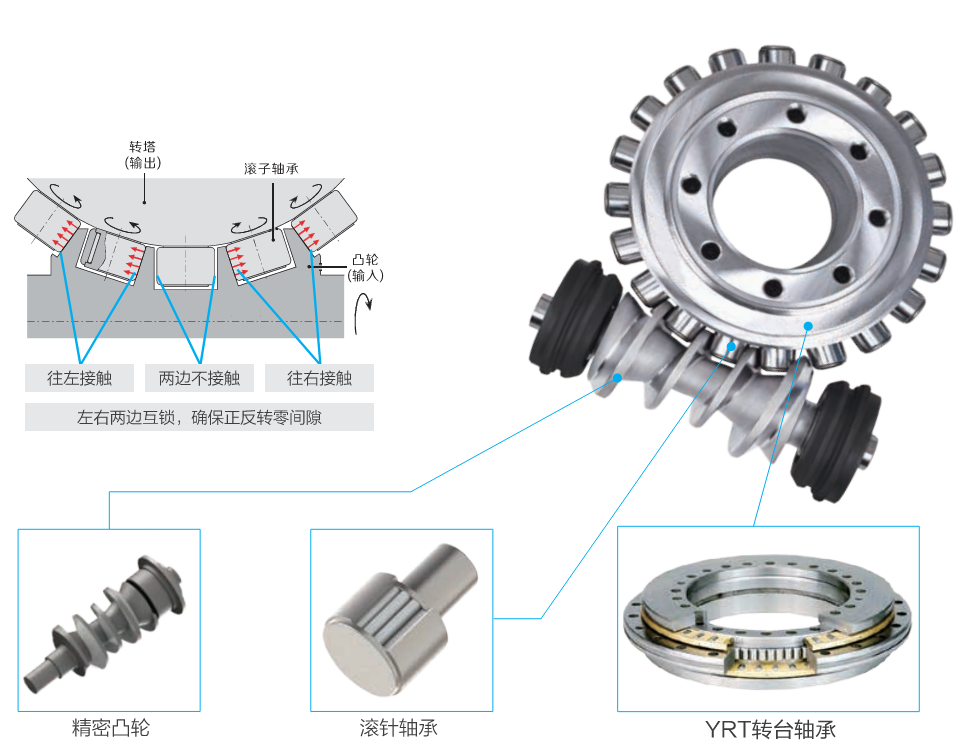 • 滾子與凸輪接觸面大 → 剛性比蝸輪蝸桿結(jié)構(gòu)轉(zhuǎn)臺更高